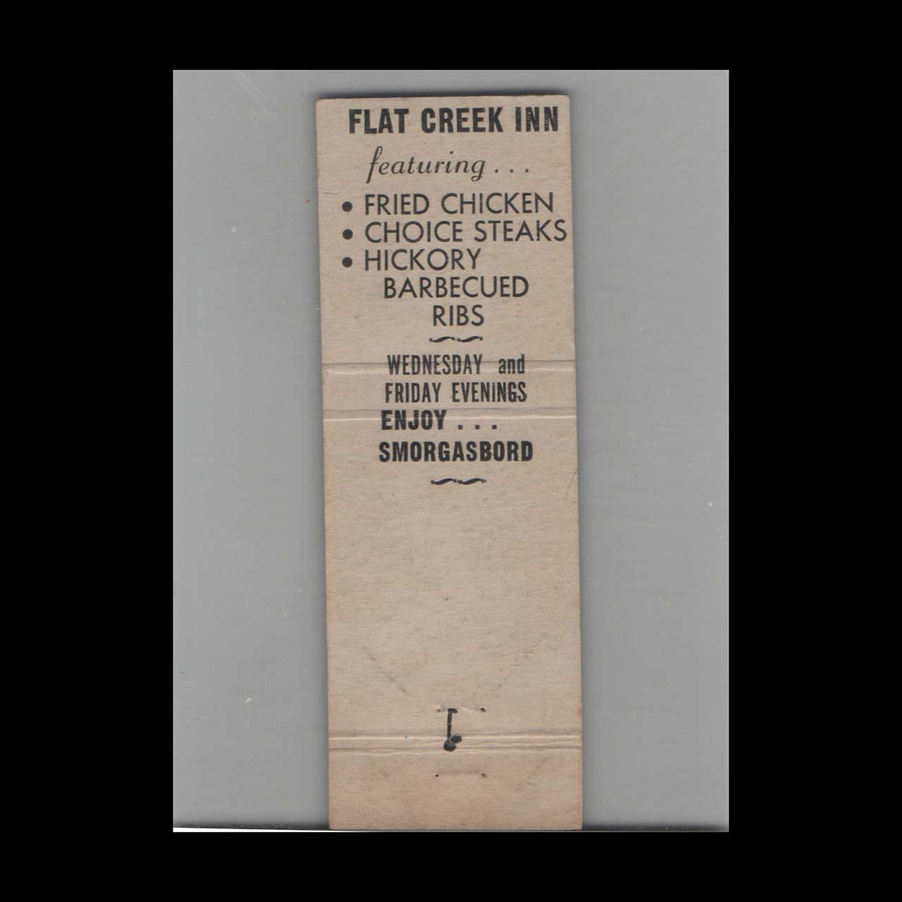 Vintage matchbook cover advertising Flat Creek Inn Sedalia, MO.