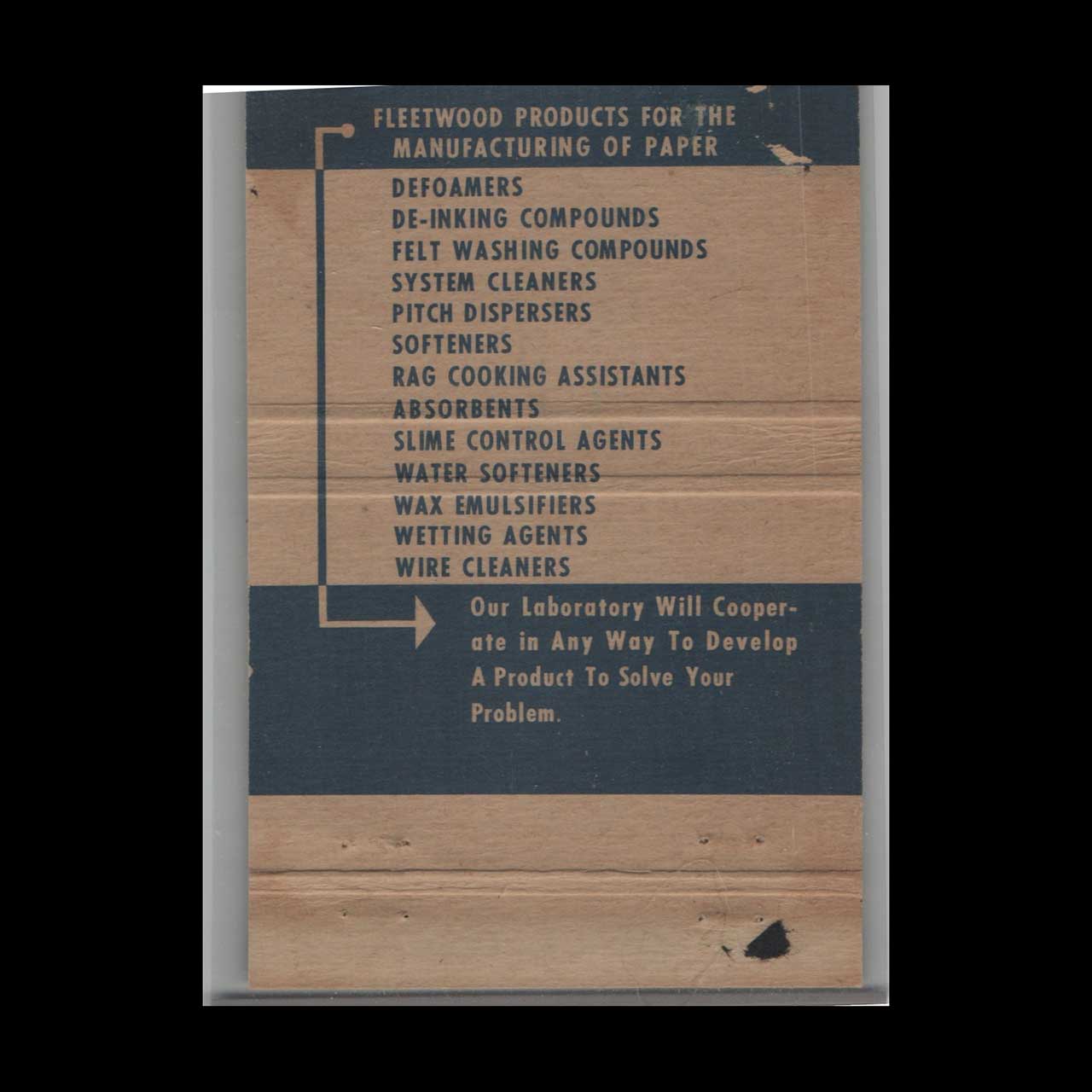 Vintage matchbook cover advertising Fleetwood Manufacturing Chemists Webster MA #1.