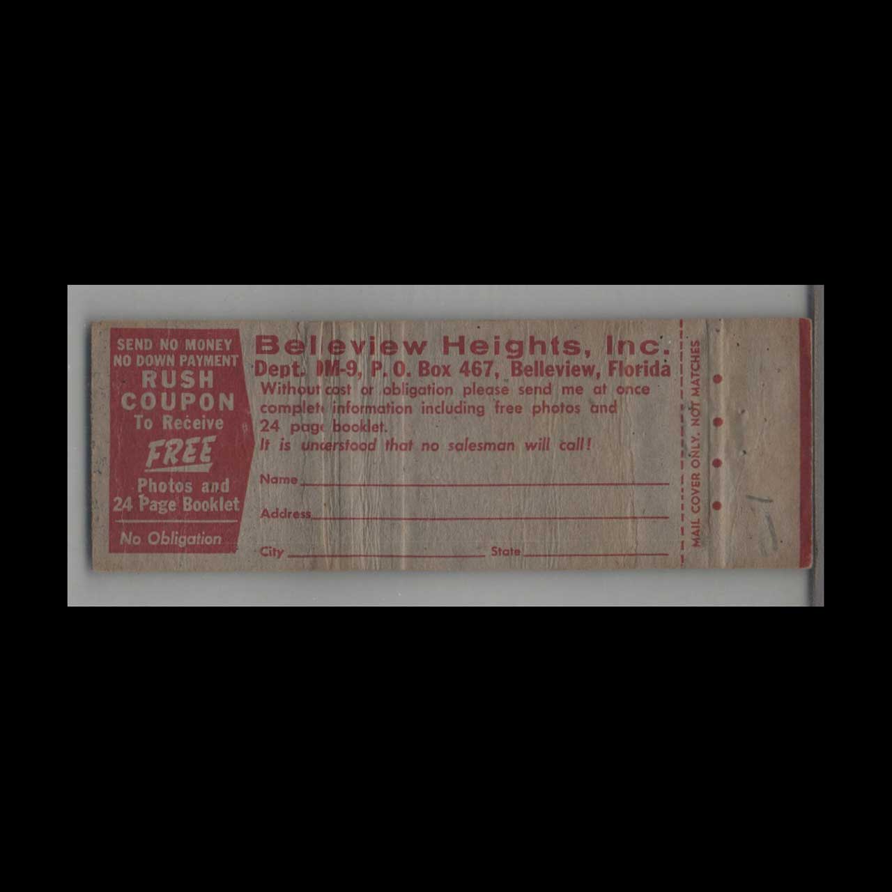 Vintage matchbook cover advertising Florida Home Sites With No Money Down.