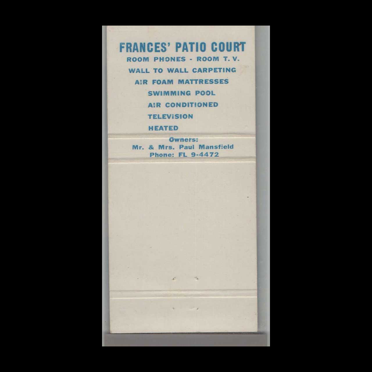 Vintage matchbook cover advertising Frances’ Patio Court Jacksonville, FL.