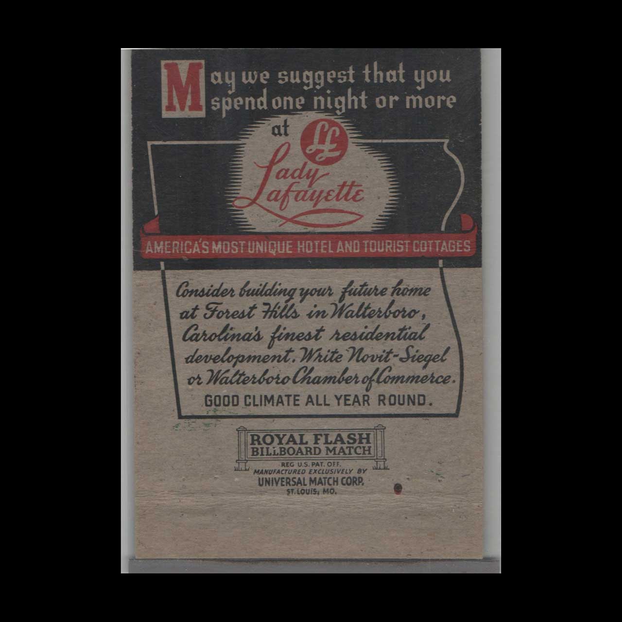 Vintage matchbook cover advertising Full Length Walterboro South Carolina – Mild Climate.