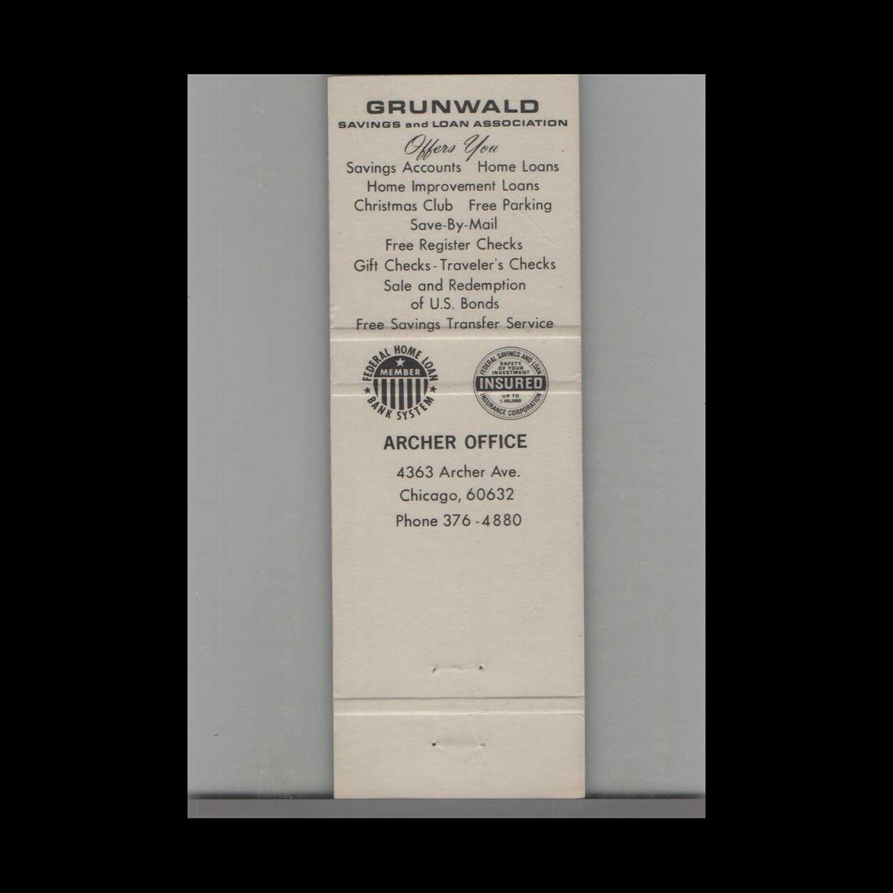 Vintage matchbook cover advertising Grunwald Savings Bank Chicago, IL.