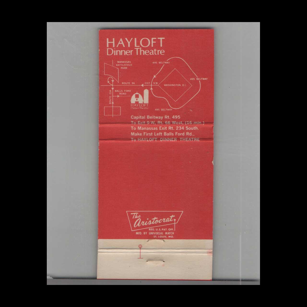 Vintage matchbook cover advertising Hayloft Dinner Theatre Manassas, VA.