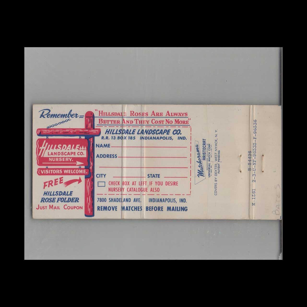 Matchbook Cover Hillsdale Landscape & Nursery Indianapolis, IN