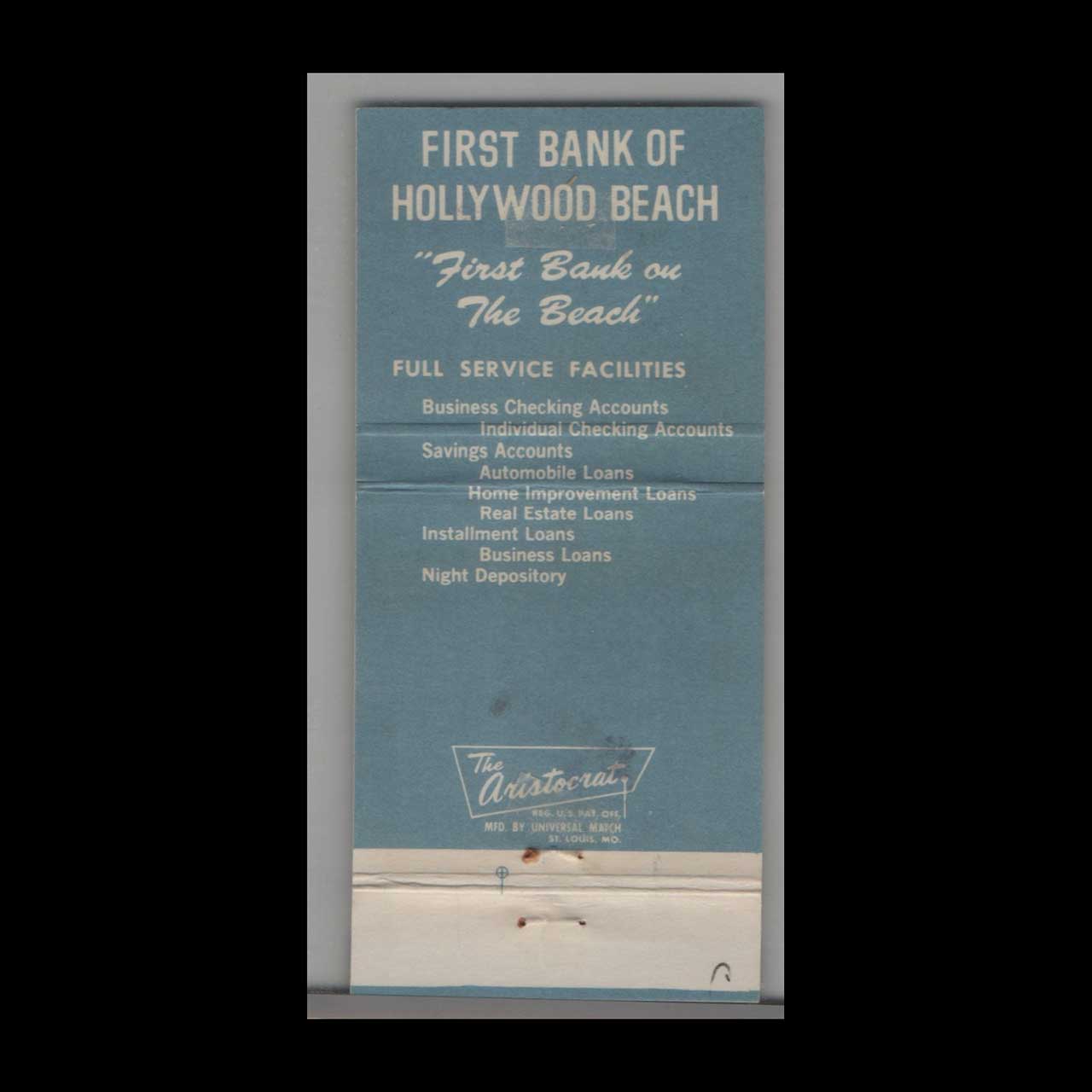 Vintage matchbook cover advertising Hollywood, Florida First Bank Of Hollywood Beach.