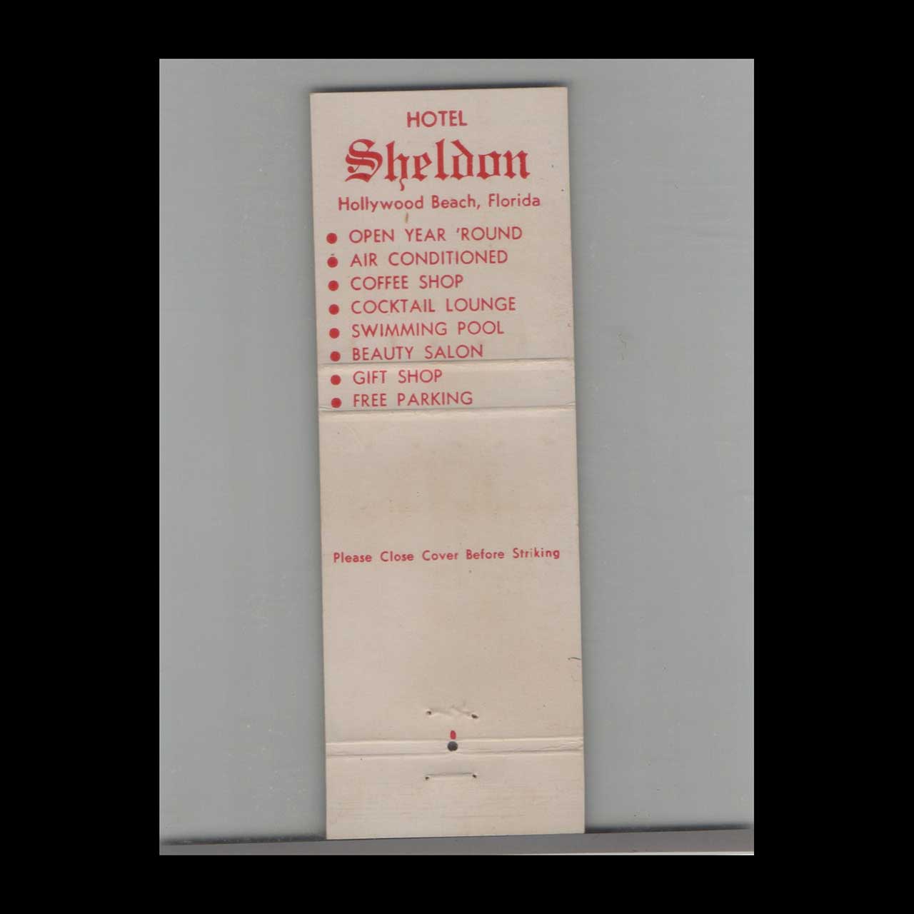 Vintage matchbook cover advertising Hollywood, Florida Hotel Sheldon On The Ocean.