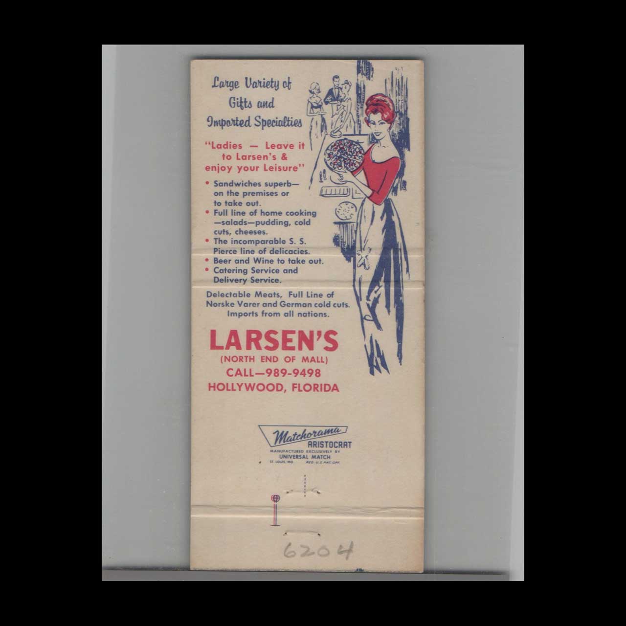 Vintage matchbook cover advertising Hollywood, Florida Larsen’s Delicatessen.