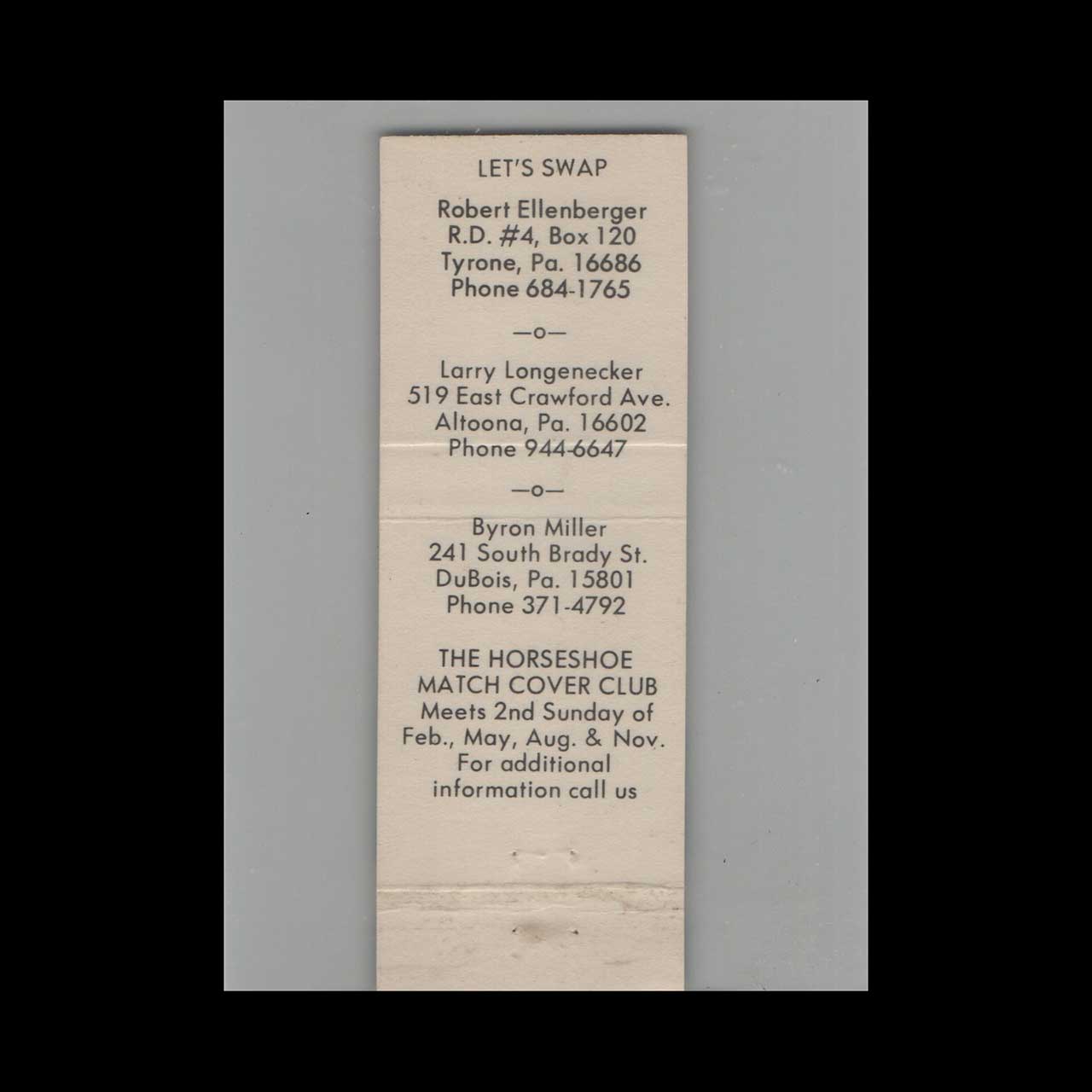 Vintage matchbook cover advertising Horseshoe Curve Matchcover Club Western Penna PA.