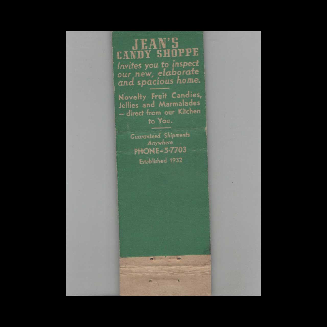 Vintage matchbook cover advertising Jean’s Candy Shoppe Miami Beach, FL.