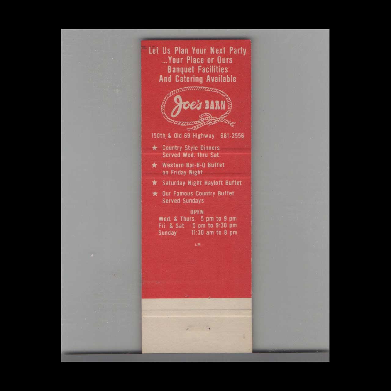 Vintage matchbook cover advertising Joe’s Barn Stanley, KS.