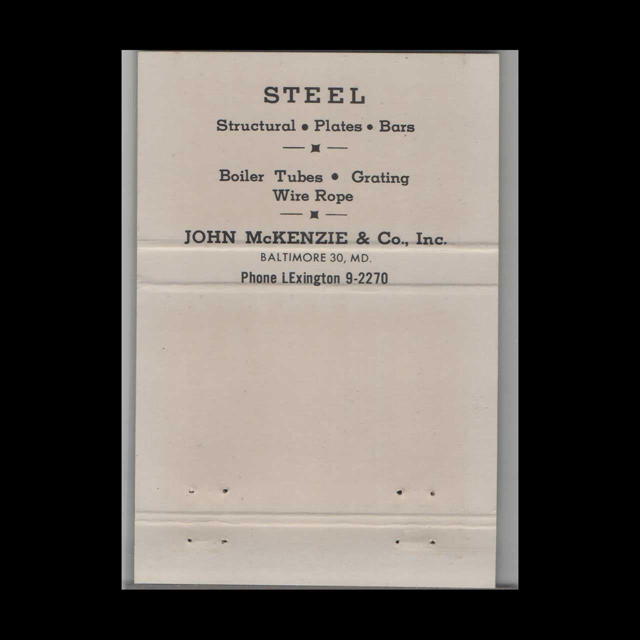 Vintage matchbook cover advertising John McKenzie & Co Steel Warehouse & Fabrication Baltimore MD.
