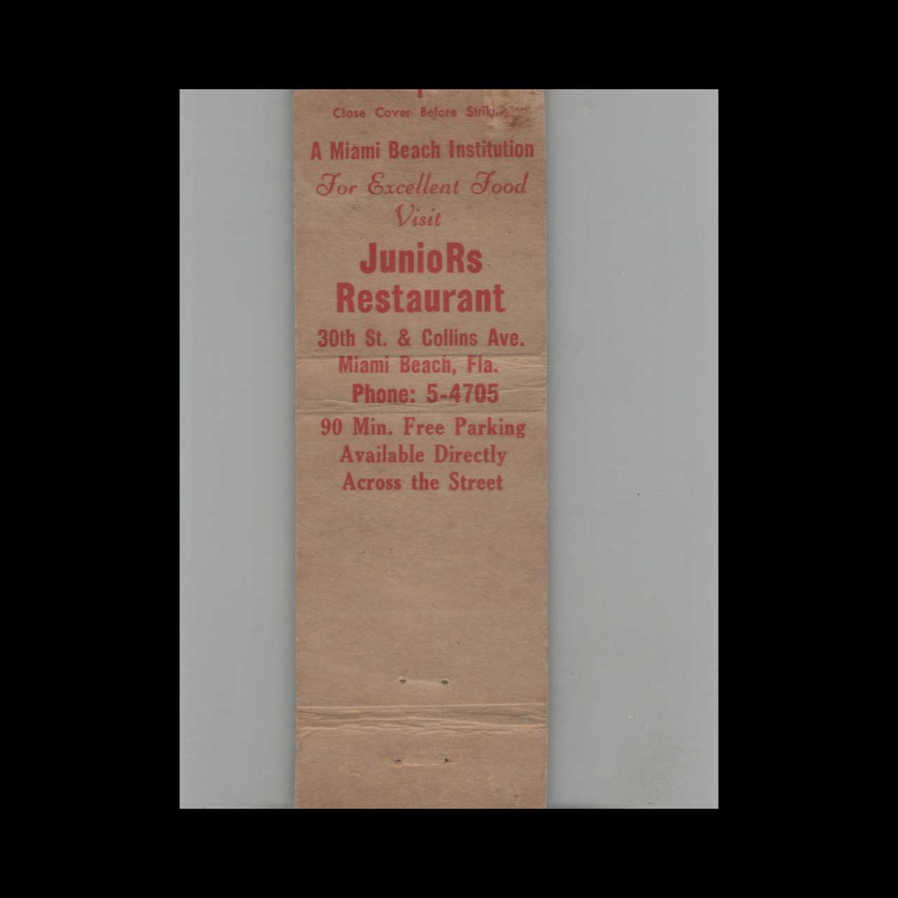 Vintage matchbook cover advertising Juniors Restaurant Miami Beach FL.