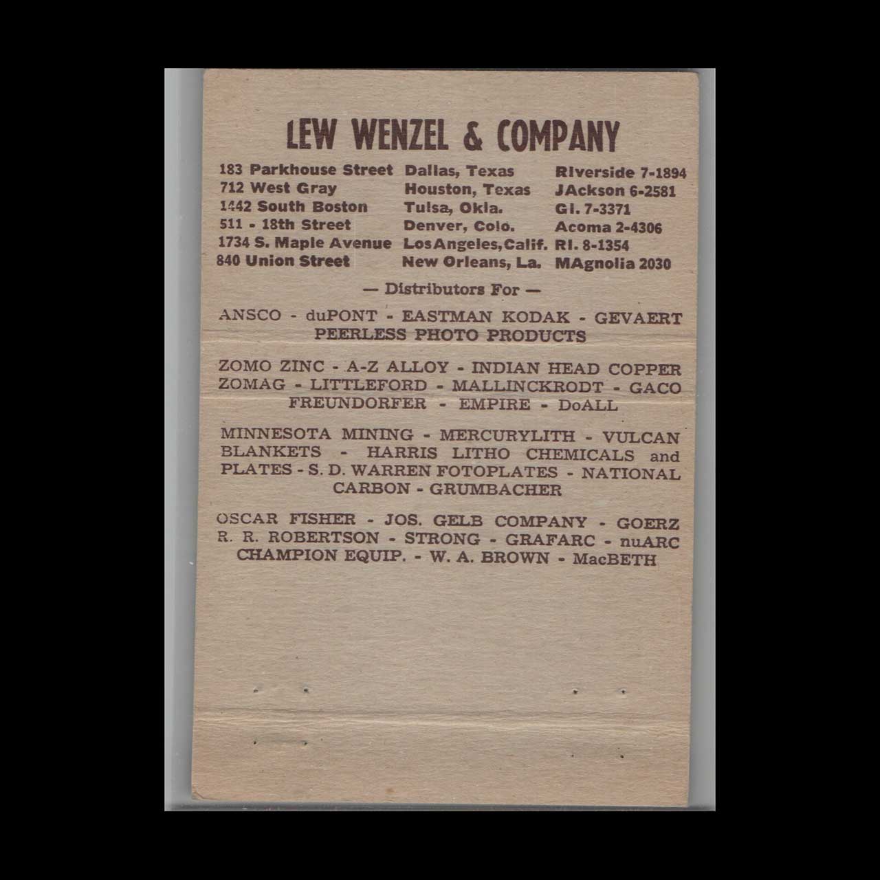Vintage matchbook cover advertising Lew Wenzel and Company Co. Tulsa OK.