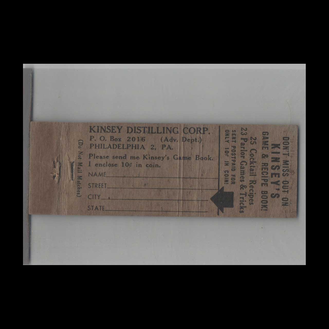 Vintage matchbook cover advertising Liquor Kinsey Blended Whiskey Linfield, PA.