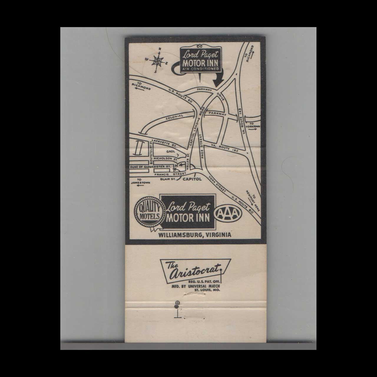 Vintage matchbook cover advertising Lord Paget Motor Inn Williamsburg, VA.
