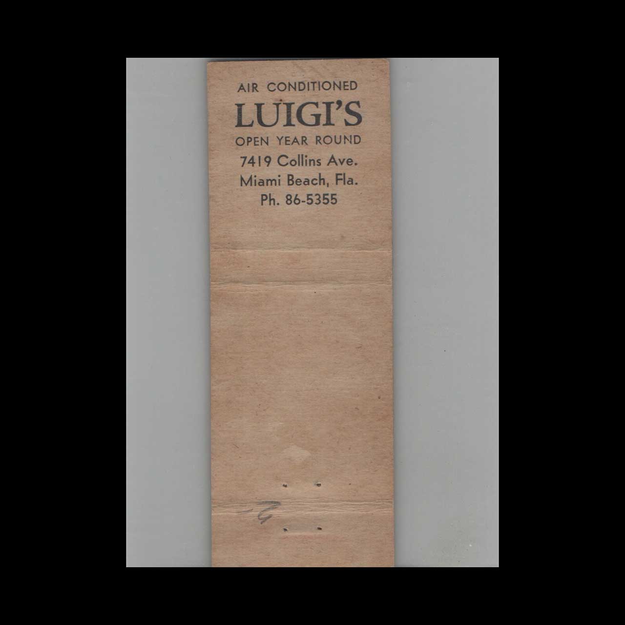 Vintage matchbook cover advertising Luigi’s Famous Italian American Restaurant Miami Beach, FL#1.