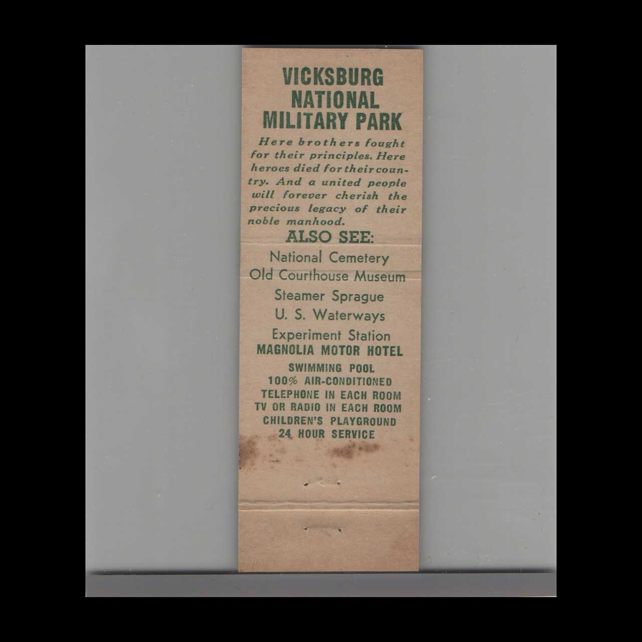 Vintage matchbook cover advertising Magnolia Motor Hotel Vicksburg MS.