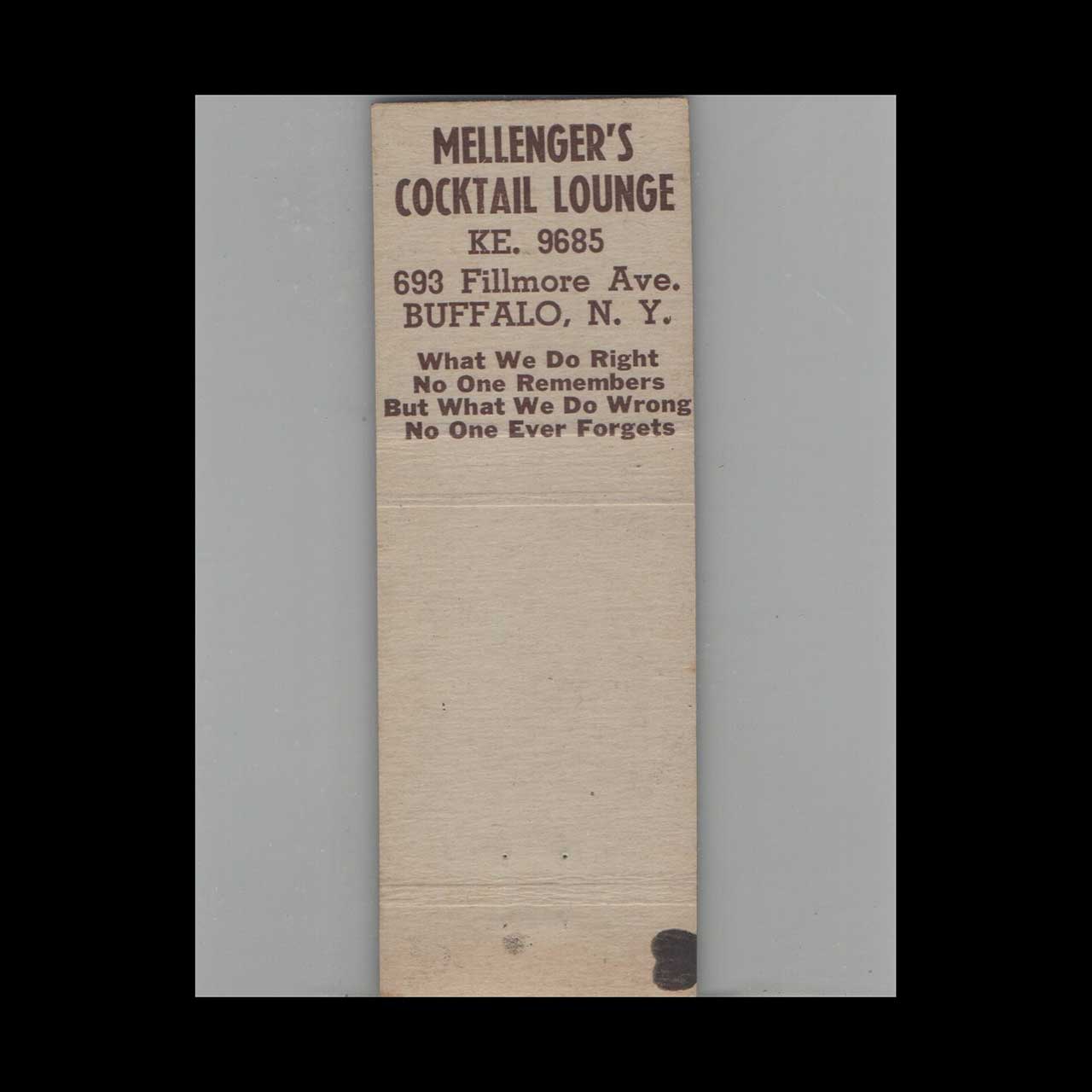 Vintage matchbook cover advertising Mellenager’s Cocktail Lounge Buffalo, NY #4.