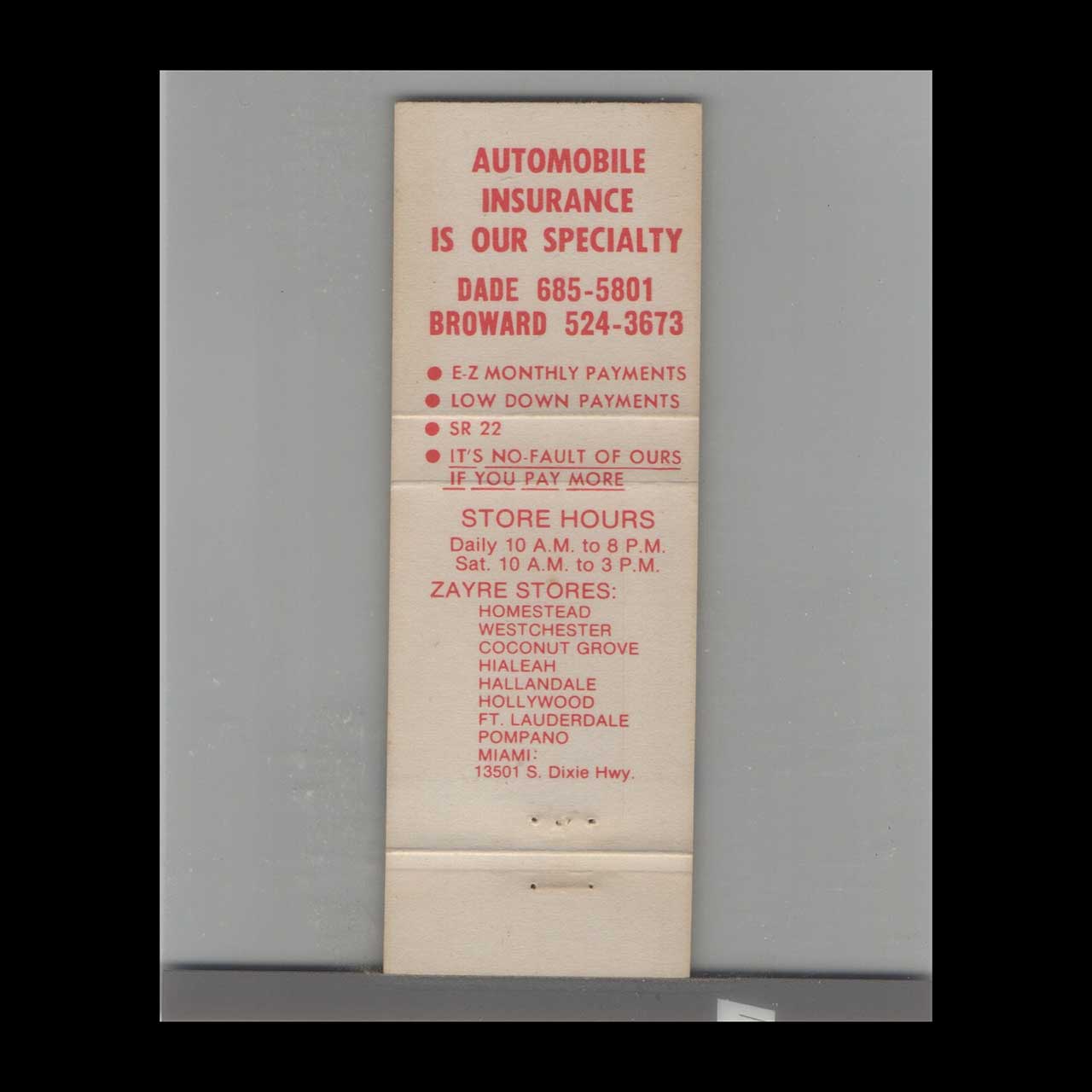 Vintage matchbook cover advertising Miami, FL Florida No-Fault Insurance Agency Inc.