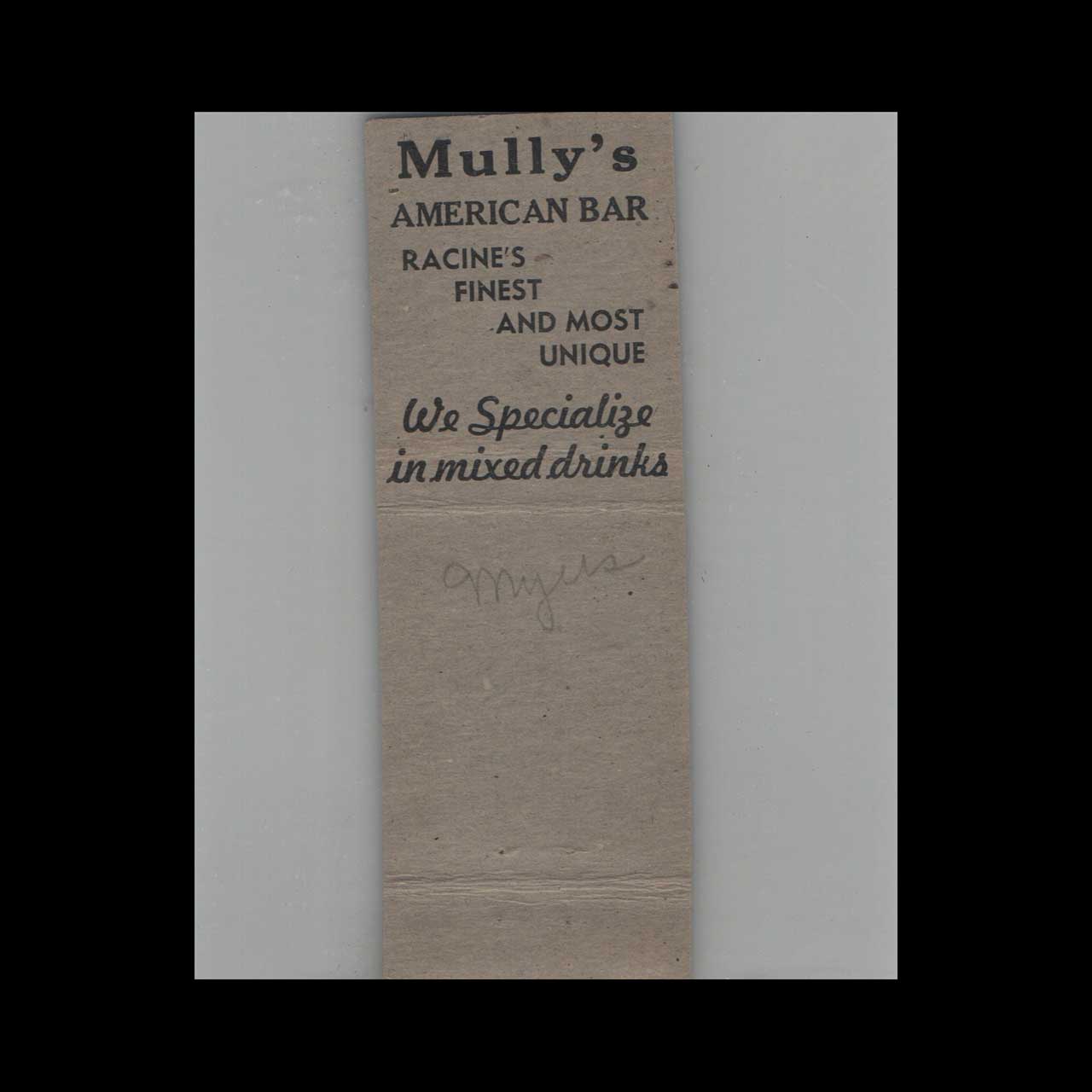 Vintage matchbook cover advertising Mully’s American Bar Racine WI.