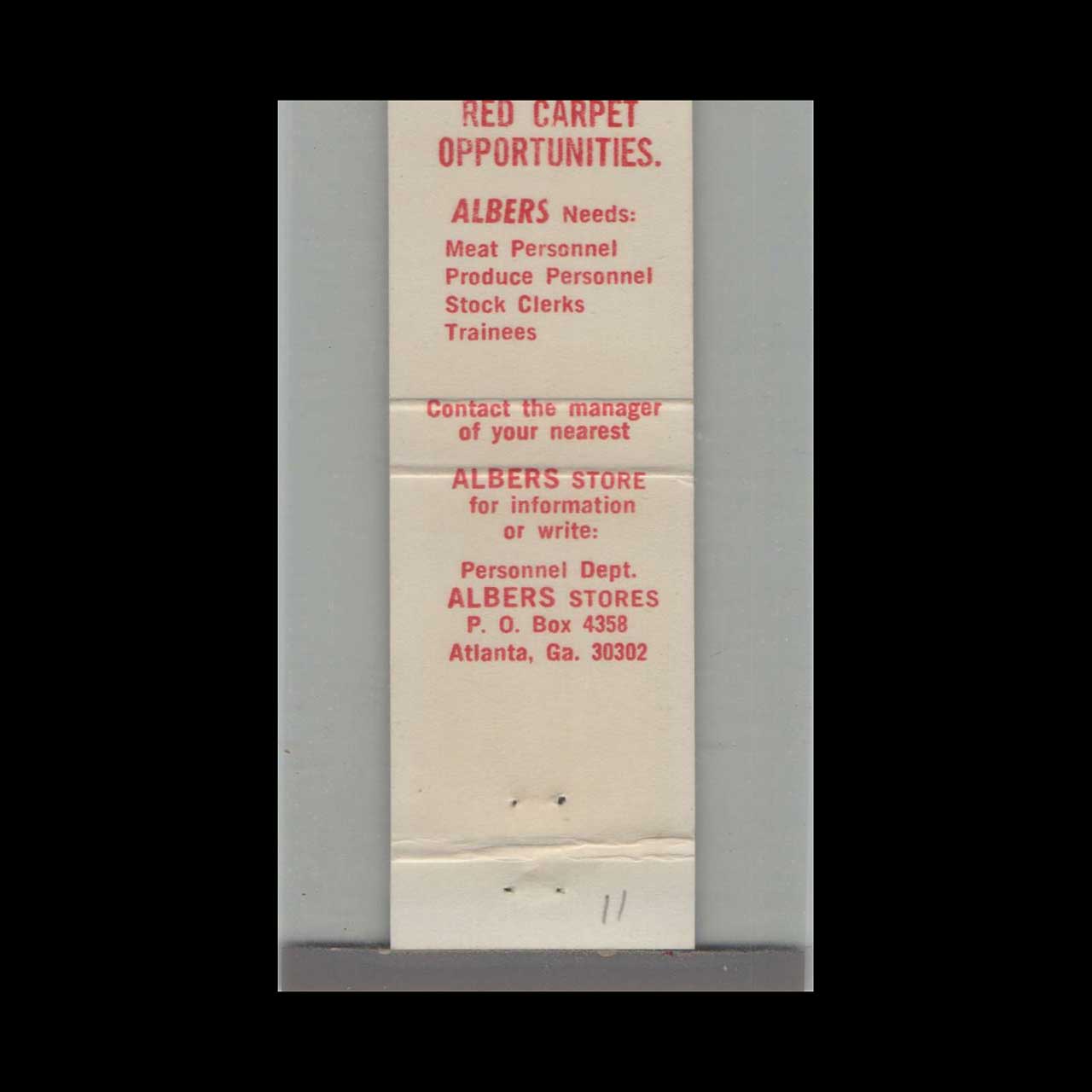 Vintage matchbook cover advertising Music Related Albers Stores Needs Meat Personnel.