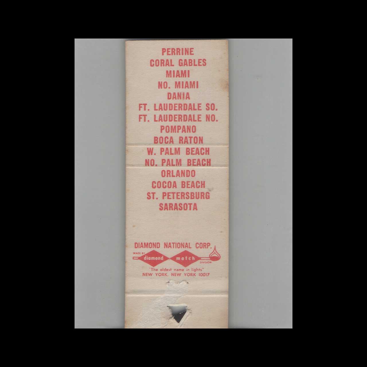 This vintage matchbook cover promotes New England Oyster House Perrine FL. Produced during the mid-century advertising era, it reflects period typography and graphic design. A collectible piece of American advertising ephemera suitable for display or archival preservation.