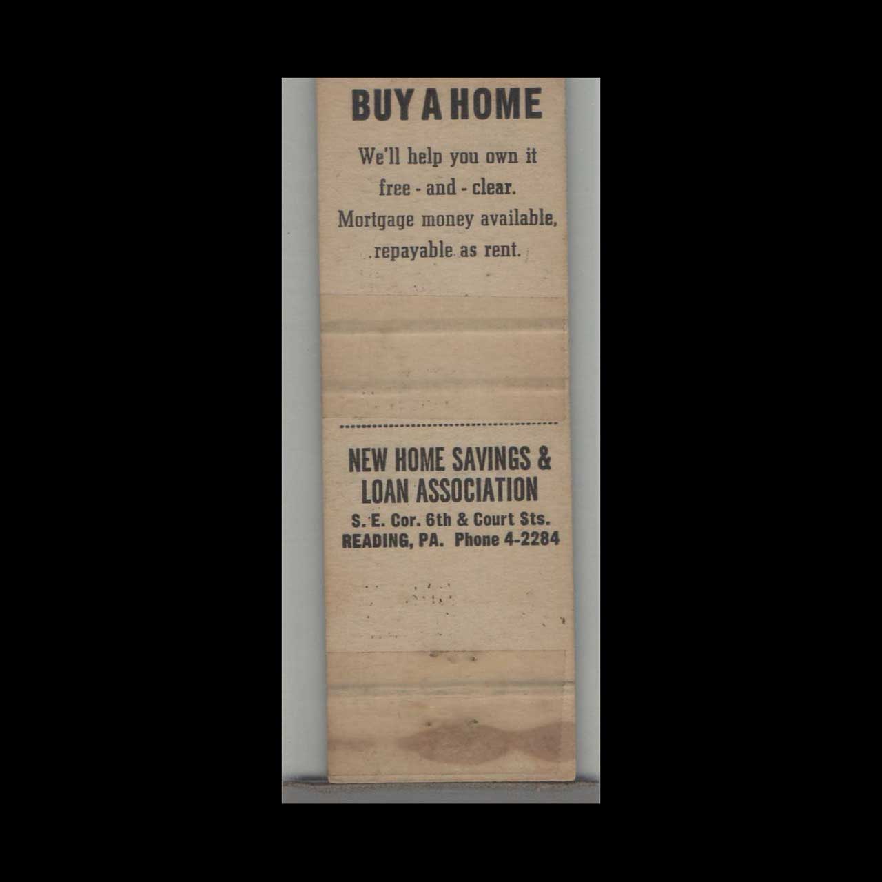 Vintage matchbook cover advertising New Home Savings & Loan Association Reading, PA.