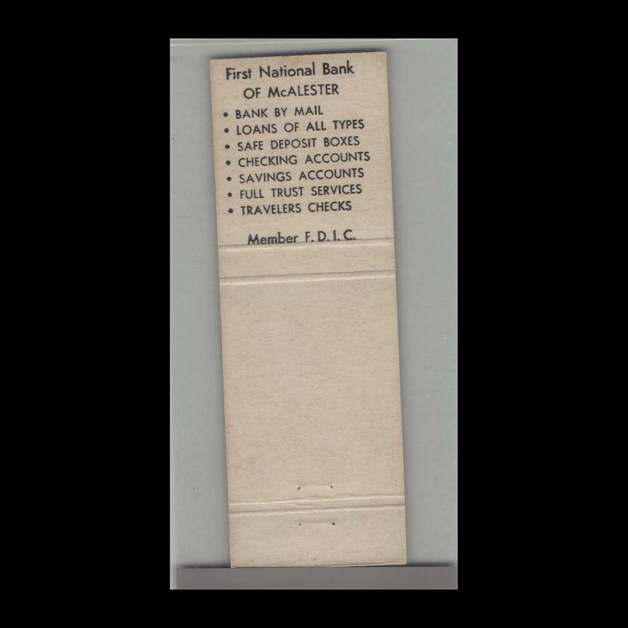Vintage matchbook cover advertising Oklahoma – First National Bank McAlester, OK.