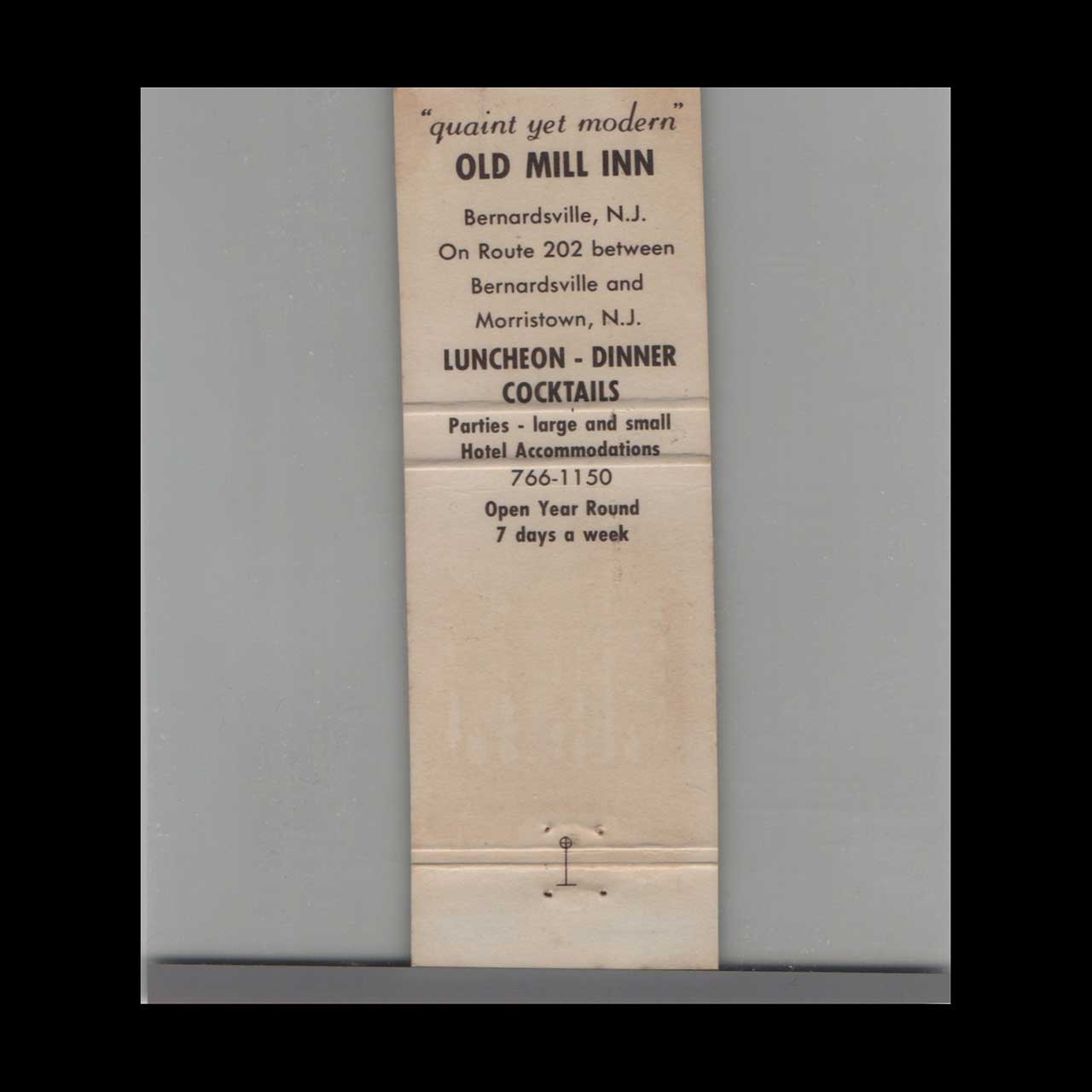 Vintage matchbook cover advertising Old Mill Inn Morristown, NJ.