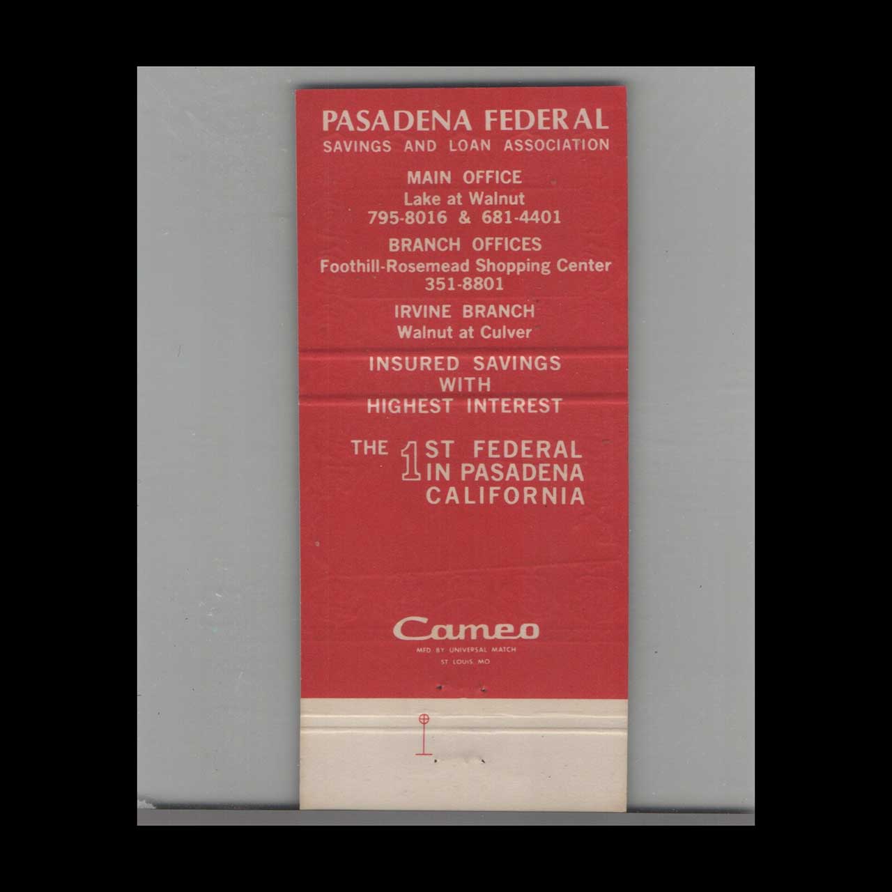 Vintage matchbook cover advertising Pasadena Federal Savings Bank Irvine, CA.