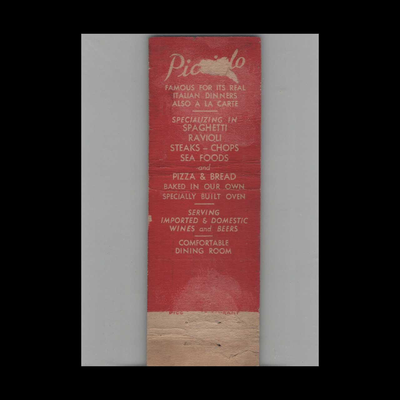Vintage matchbook cover advertising Picciolo Italian-American Restaurant Miami Beach FL.