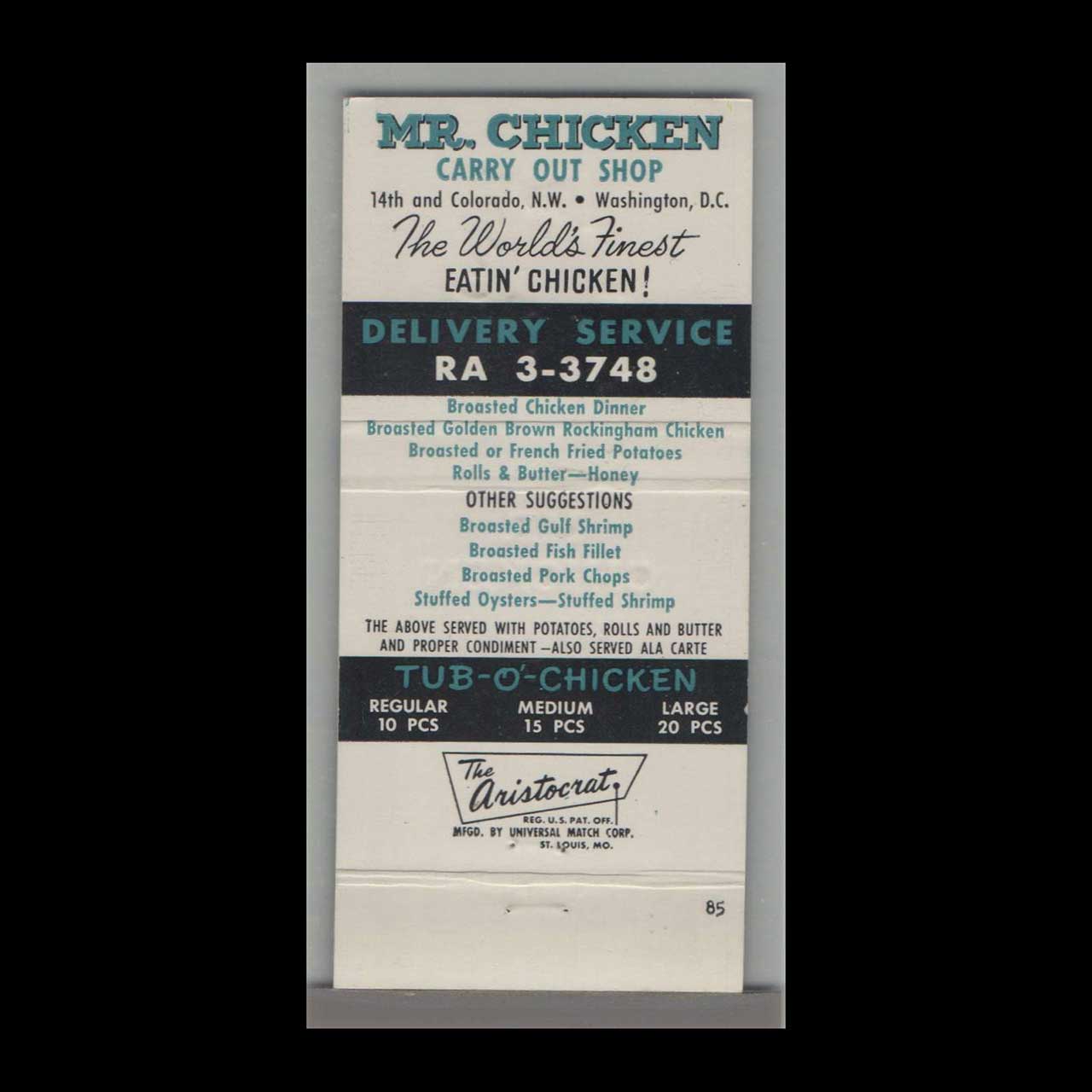 Discover Mr. Chicken Carry Out Shop in Washington, DC, a beloved local eatery known for its iconic rooster logo. This vintage matchbook cover is a classic ephemera relic cherished by Americana collectors.