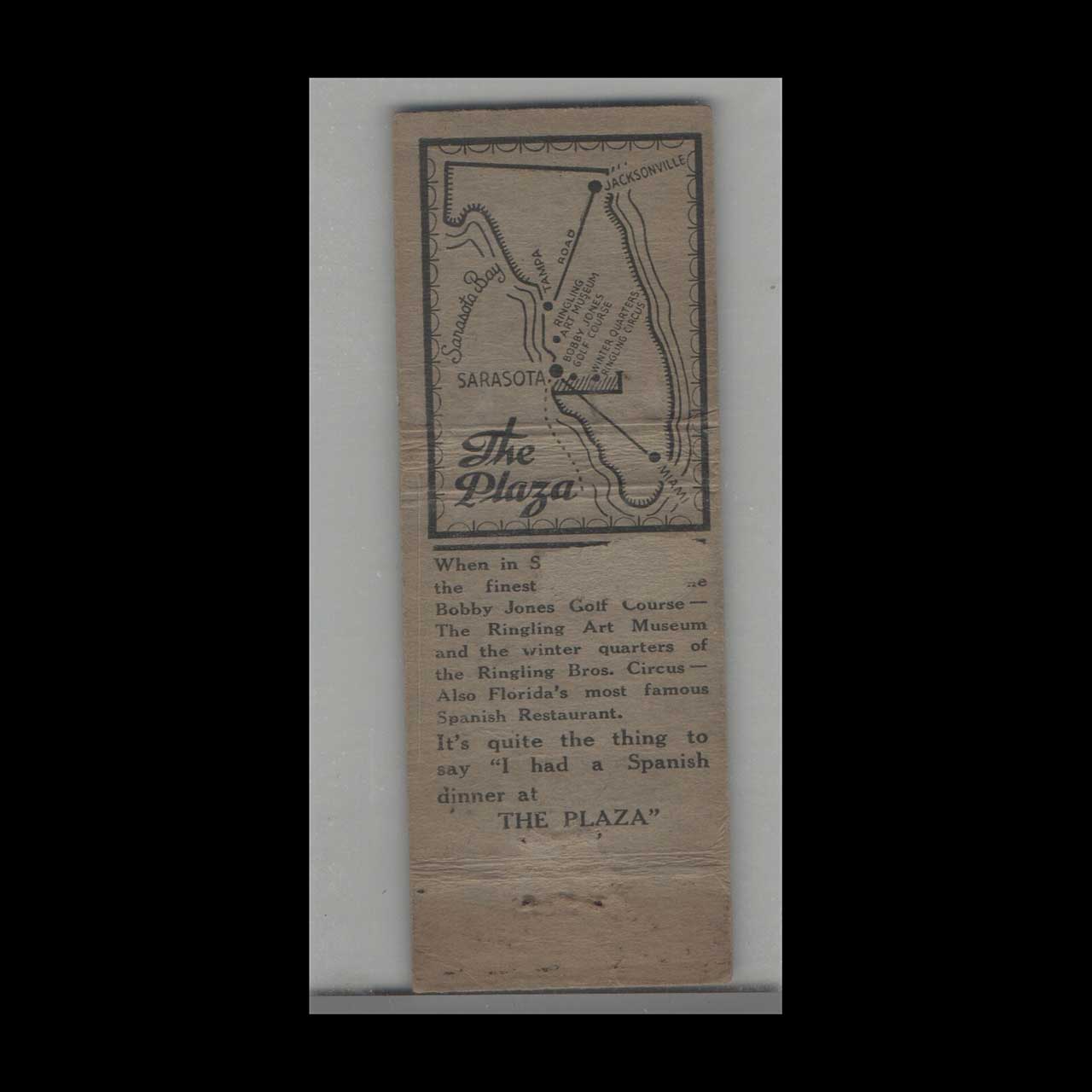 Vintage matchbook cover advertising Sarasota, FL Plaza Spanish Restaurant.