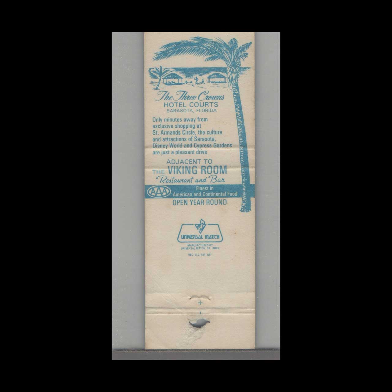 Vintage matchbook cover advertising Sarasota, FL Three Crowns Hotel.