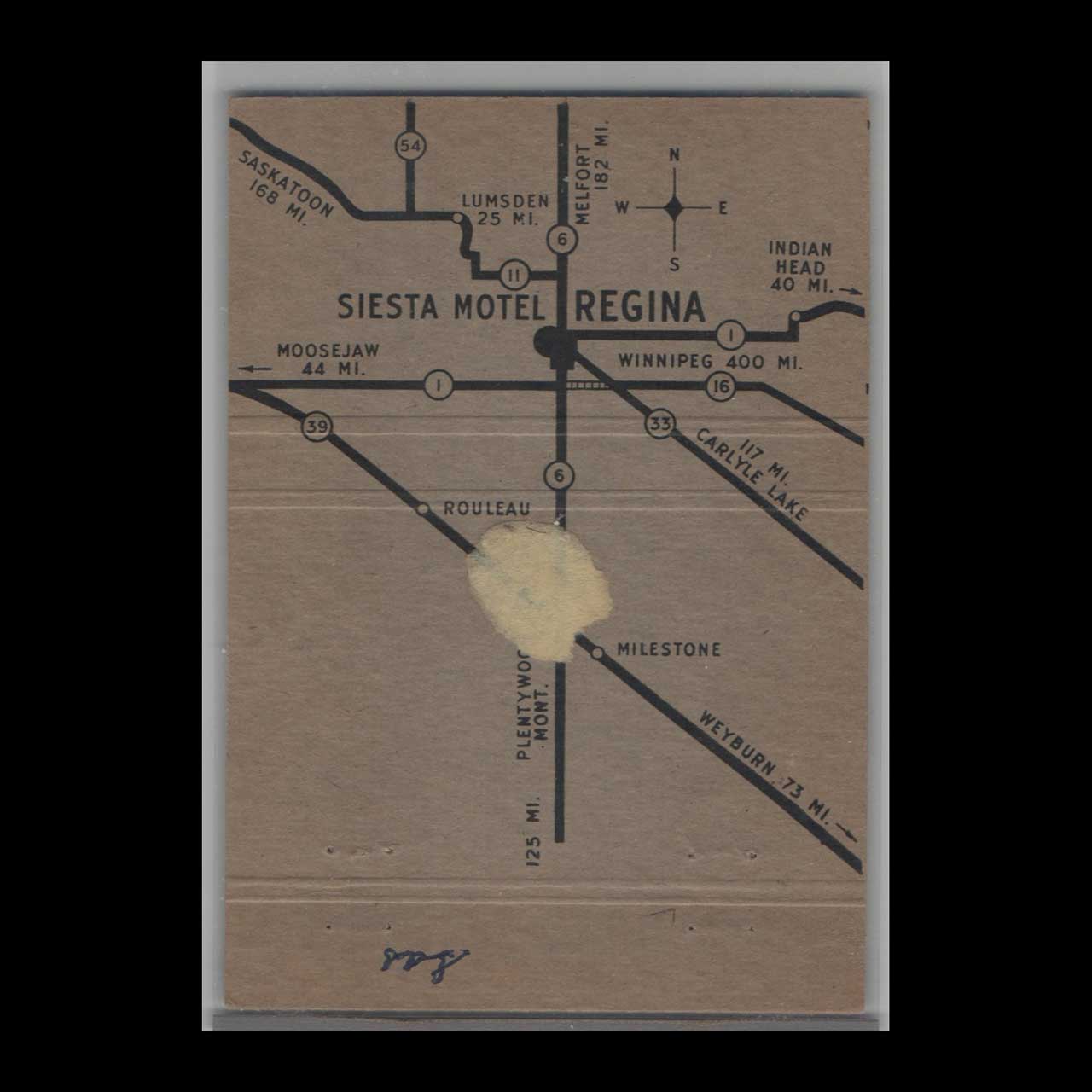 Vintage matchbook cover advertising Siesta Motel & Restaurant East Regina, SASK Canada.