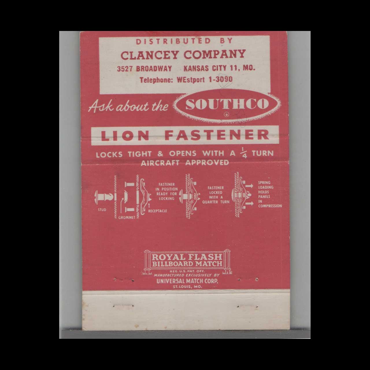 Vintage matchbook cover advertising Southco Fasteners Lester, PA.