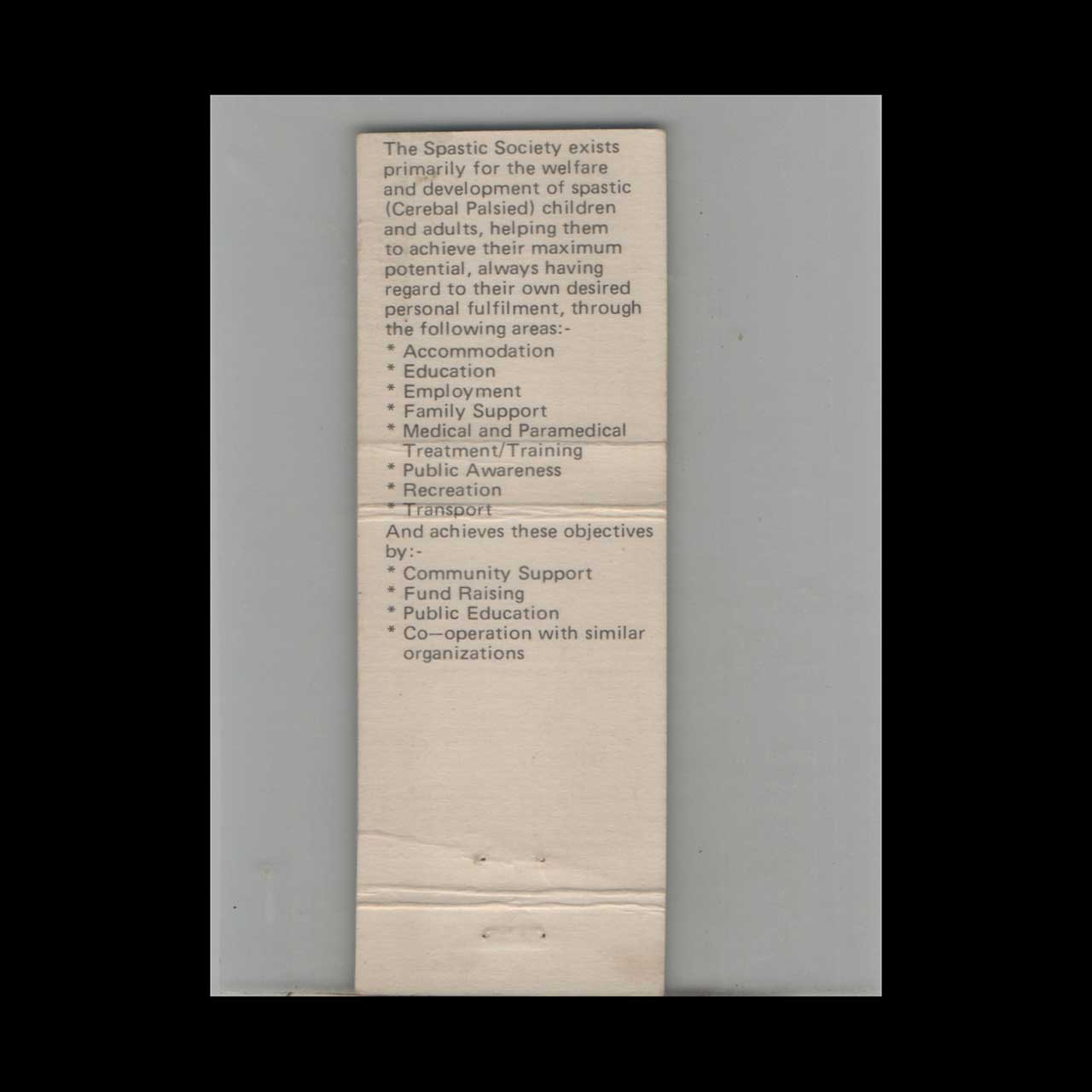 Matchbook Cover Spastic Society For The Welfare Of Cerebral Palsied
