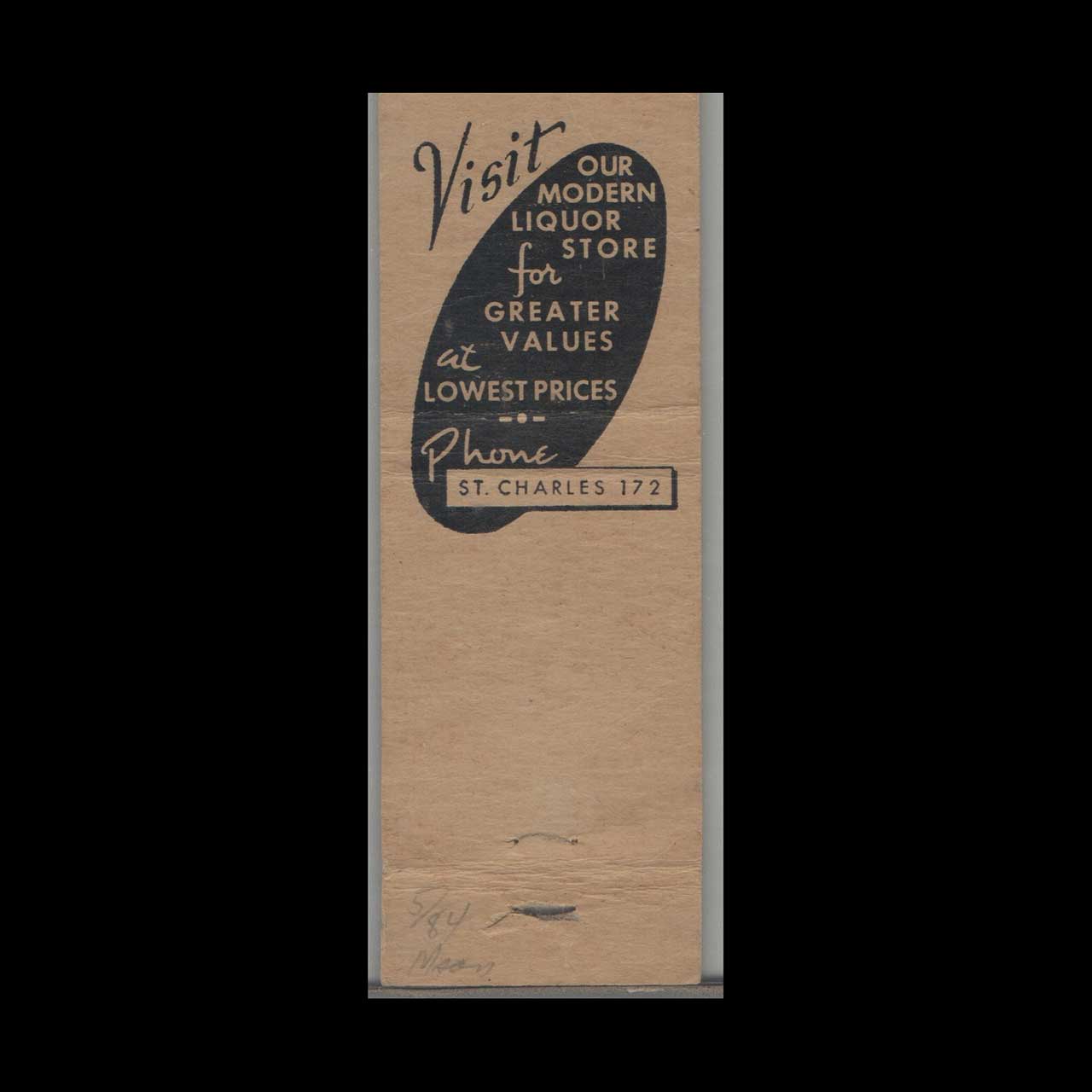 This vintage matchbook cover promotes St. Charles Hotel St. Charles, IL. Produced during the mid-century advertising era, it reflects period typography and graphic design. A collectible piece of American advertising ephemera suitable for display or archival preservation.