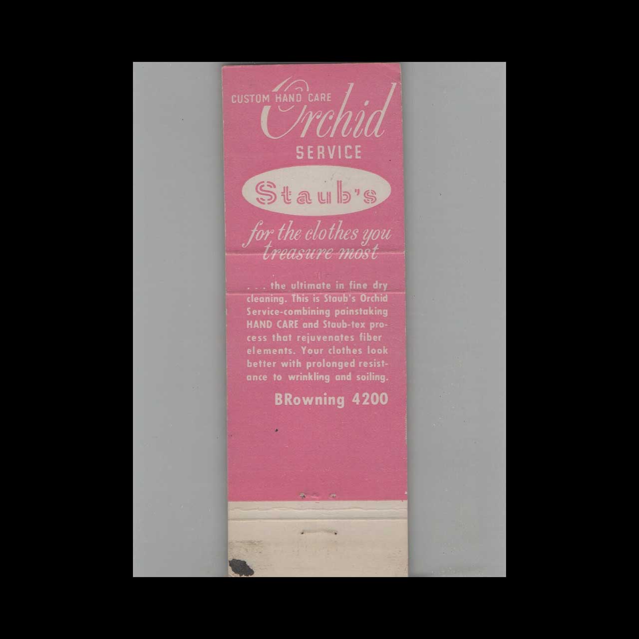 Vintage matchbook cover advertising Staub’s Dry Cleaners.