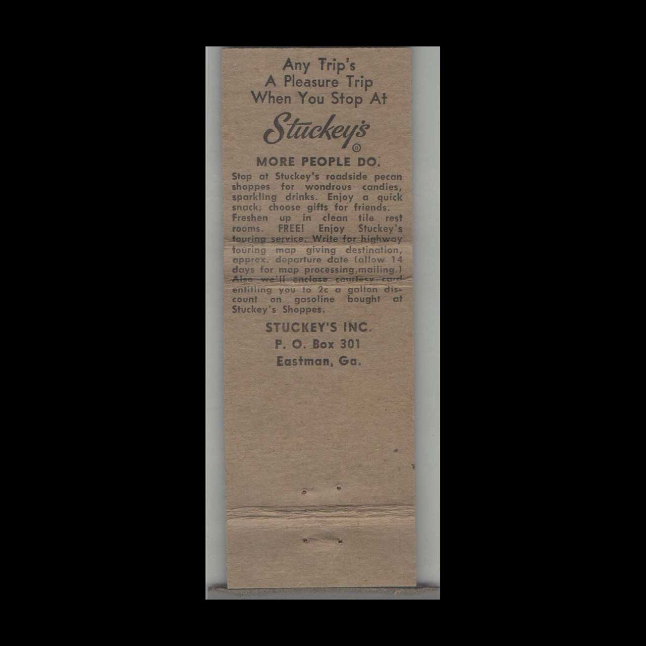 Vintage matchbook cover advertising Stuckey’s Pecan Shoppes.