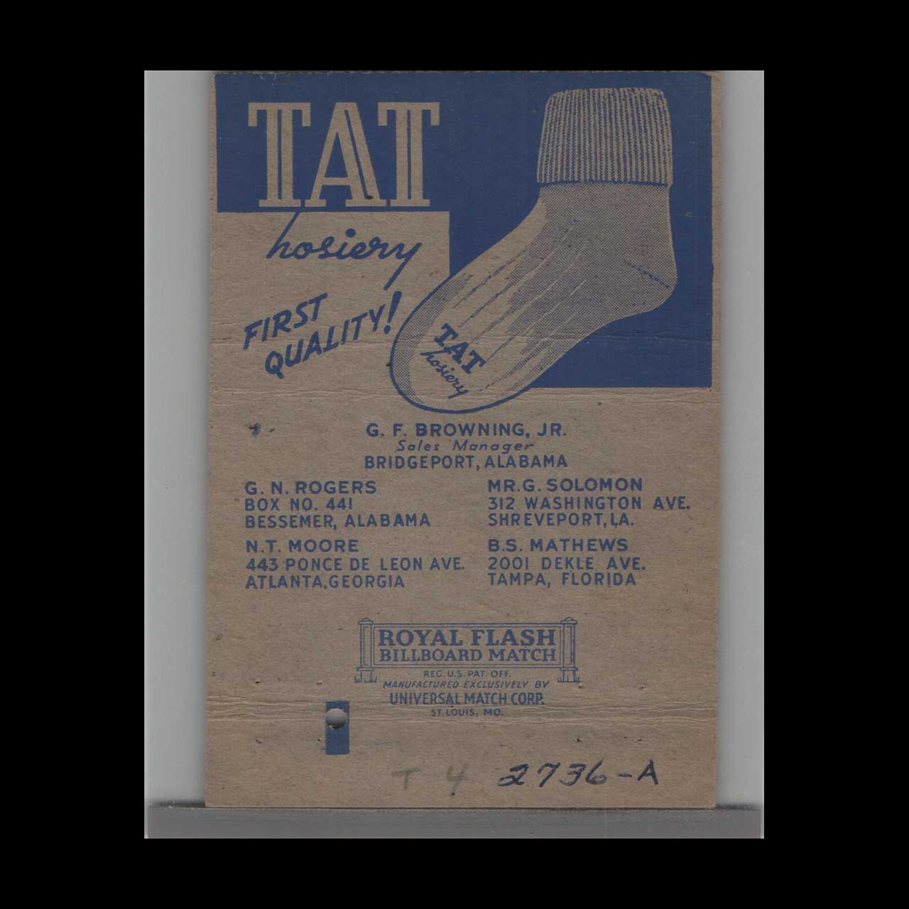 Vintage matchbook cover advertising TAT Hosiery Mills Bridgeport, AL.