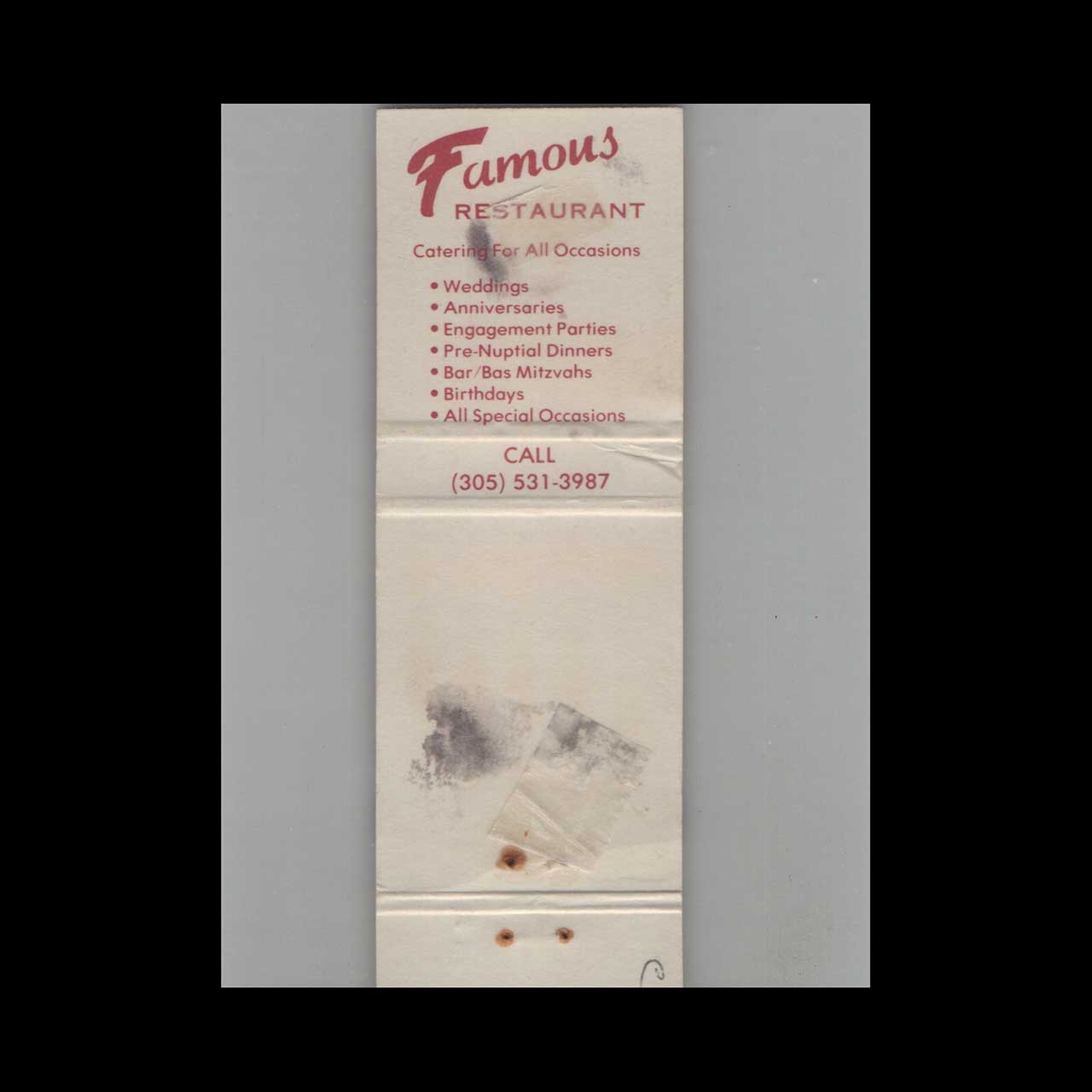 Vintage matchbook cover advertising The Famous Restaurant Miami Beach, FL.