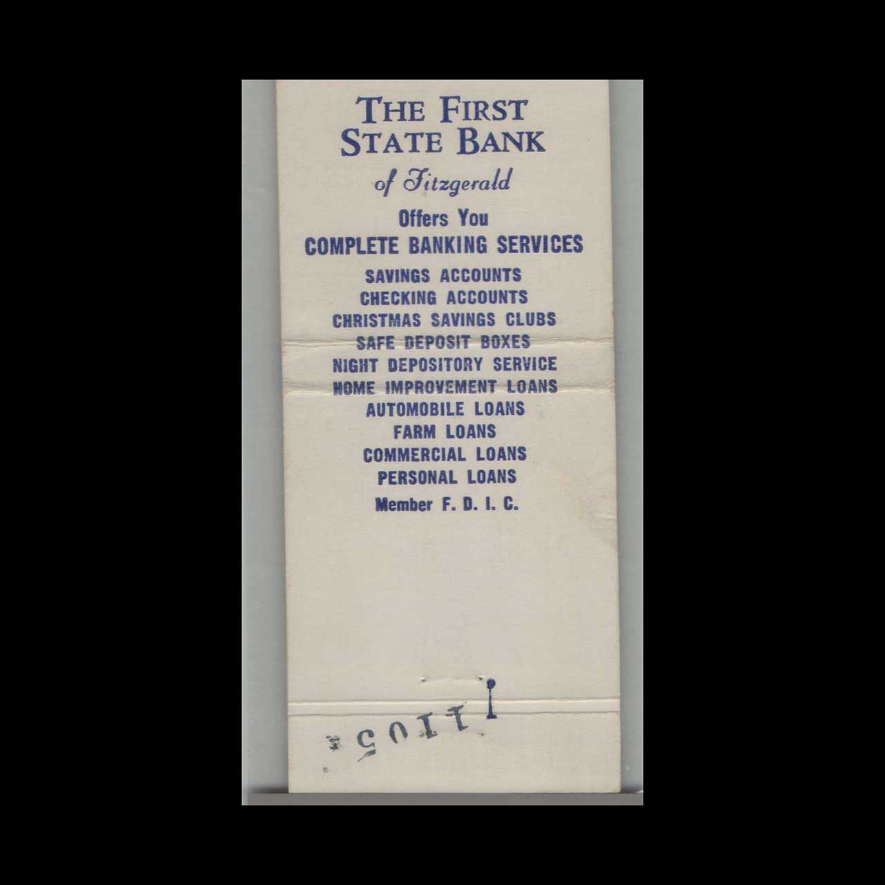 Vintage matchbook cover advertising The First State Bank of Fitzgerald, GA.