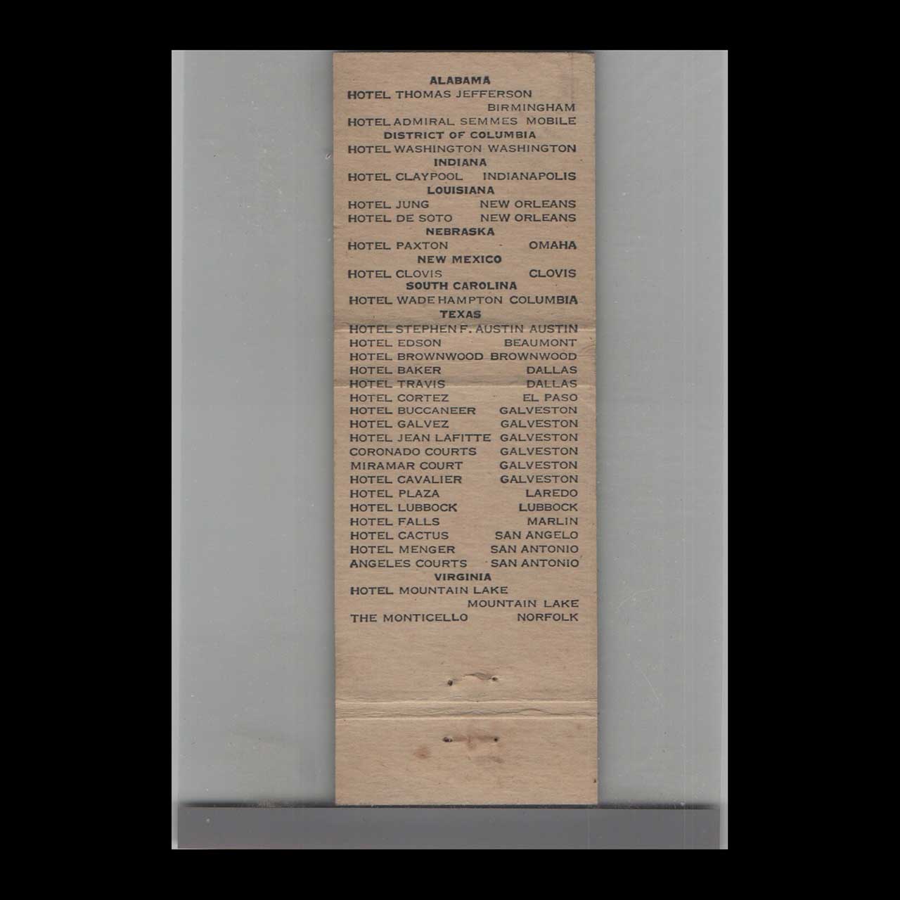 Vintage matchbook cover advertising The Greater Jung Hotel New Orleans, LA.