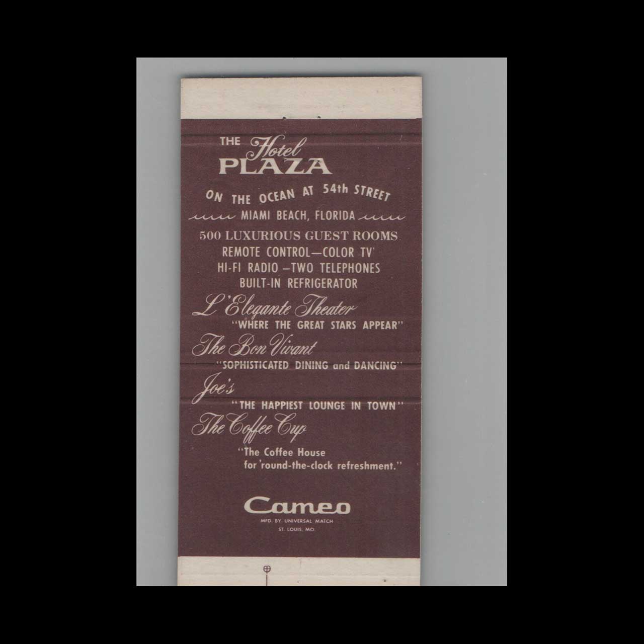Vintage matchbook cover advertising The Hotel Plaza Miami Beach FL.