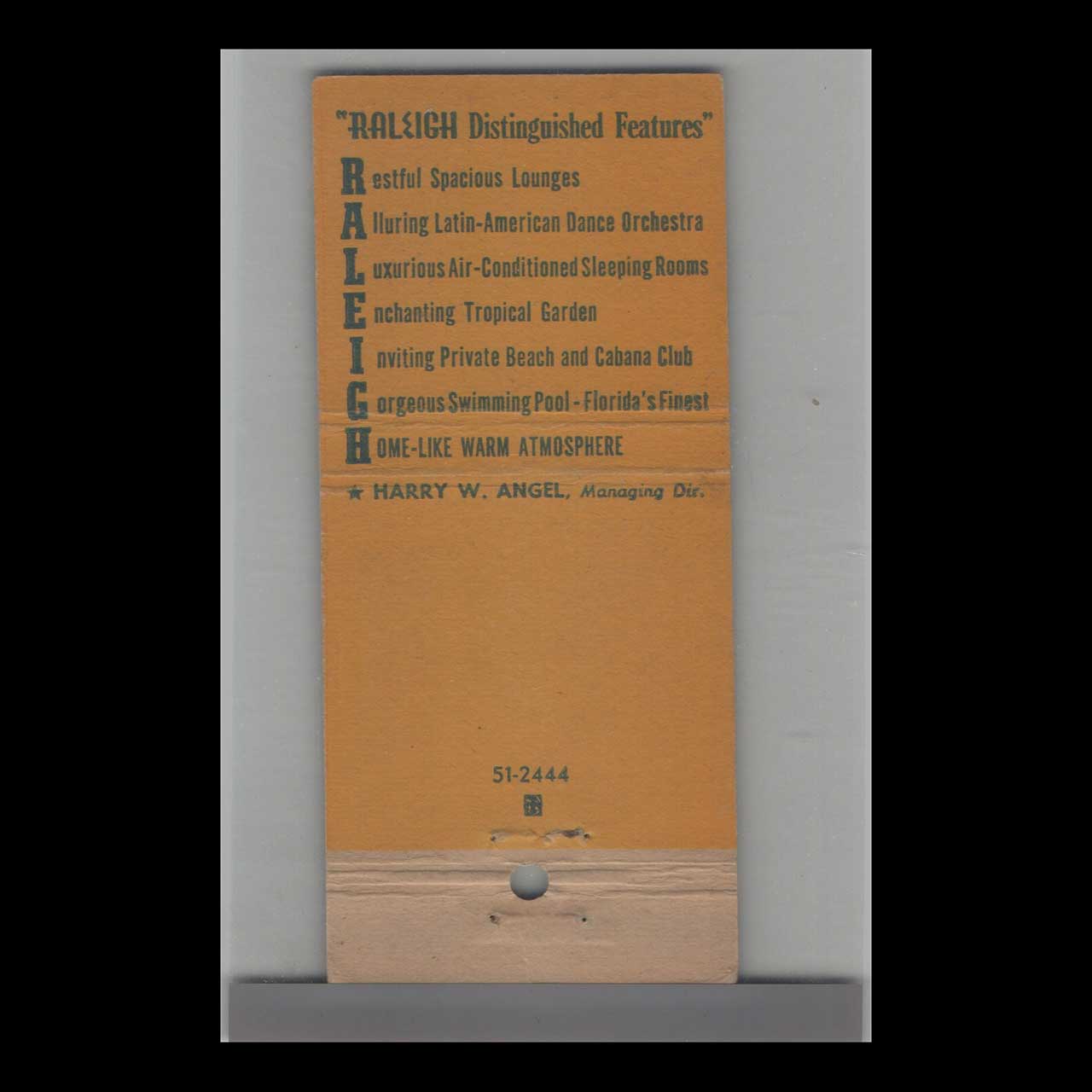Vintage matchbook cover advertising The Raleigh Hotel Miami Beach, FLK.