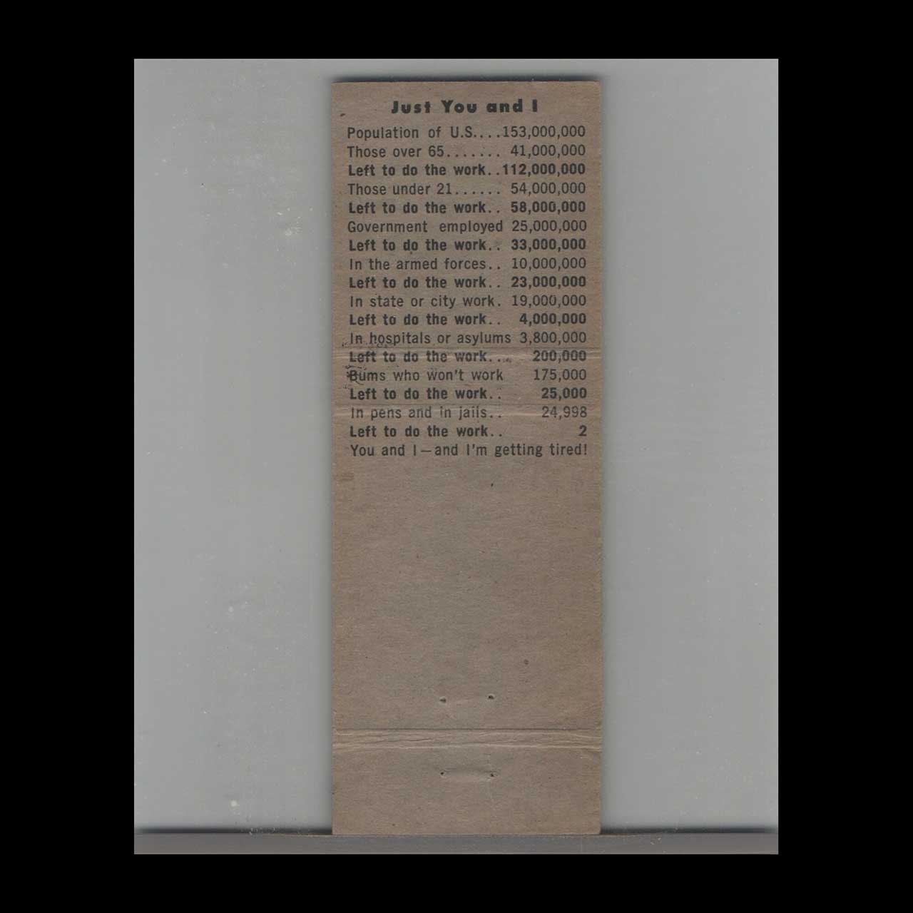 This vintage matchbook cover promotes Walt’s Place Foxholm ND. Produced during the mid-century advertising era, it reflects period typography and graphic design. A collectible piece of American advertising ephemera suitable for display or archival preservation.