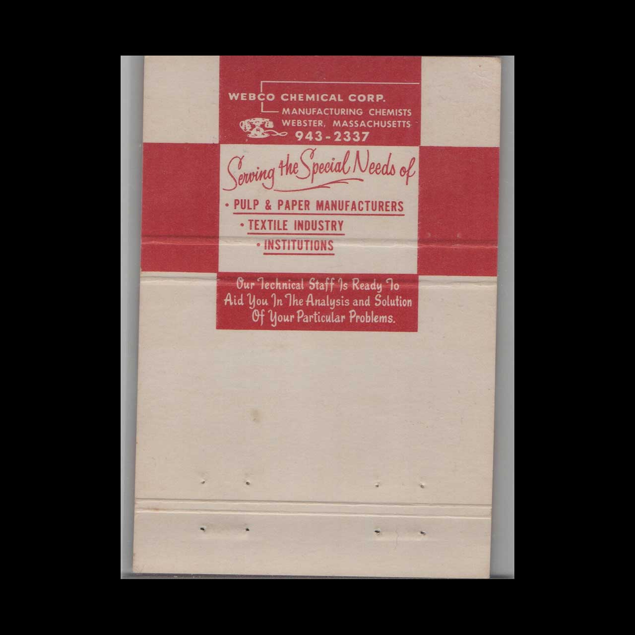 Vintage matchbook cover advertising Webco Chemicals Webster, MA.