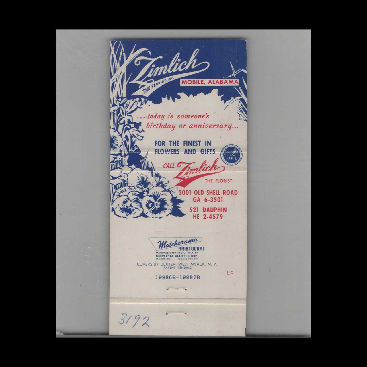 Vintage matchbook cover advertising Zimlich Florists Mobile, AL.