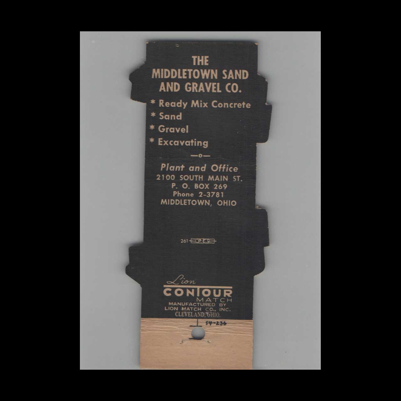 The Middletown Sand & Gravel Co in Middletown, OH, provided essential materials for construction and industry. This Lion Contour matchbook is a classic ephemera relic cherished by Americana collectors.